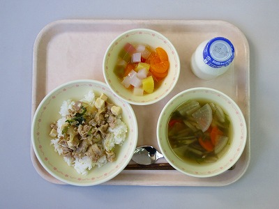 肉豆腐丼、牛乳、根菜スープ、ナタデココポンチ