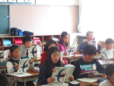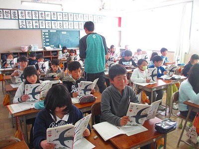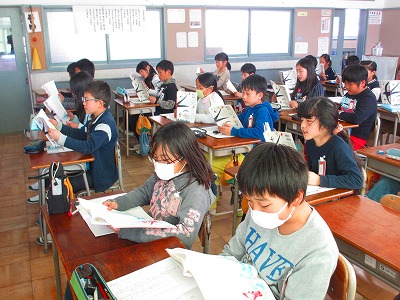 4年生が国語の学習で「初雪のふる日」の音読練習をしていました。教師の後について「追い読み」をしていました。一語一語、一文一文を滑らかに読めるよう、繰り返していました。