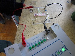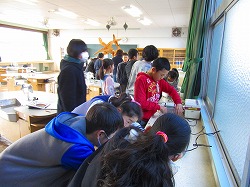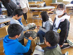 6年生が太さの違う電熱線に電流を流し熱を発生させ、電熱線にふれた発ぽうポリスチレンが溶ける時間をはかる実験を行っていました。太い電熱線と細い電熱線では、溶ける時間に違いがあることが分かりました。