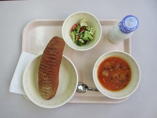 きな粉揚げパン、牛乳、彩り野菜サラダ、トマトスープ
