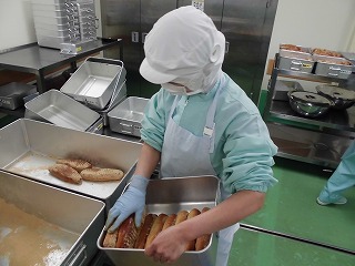 約1年ぶりの揚げパンの登場です。今回はきな粉揚げパンにしました。ミルクロールパンを油で揚げ、きな粉とグラニュー糖をまぶして配缶します。パンは油をよく吸収してしまうので、揚げ時間は1分程度にしています。