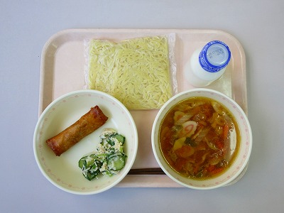 しょうゆラーメン、牛乳、春巻、棒棒鶏