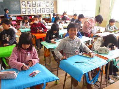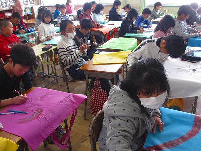 4年生が、学校にある作品などを持ち帰るのに使う大きな袋に、思い思いの絵を描いていました。4年生の思い出を大切に持ち帰ってくださいね。