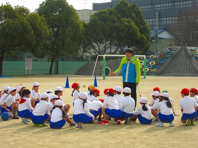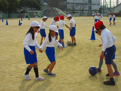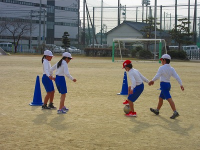 3年生がサッカーに取り組んでいました。2人で手をつなぎながらの攻防をしていました。守ることも攻めることも一人ではなく、手をつなぐことにより面を意識してボールを操作していました。