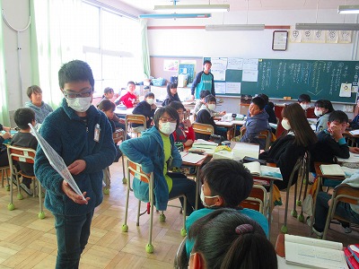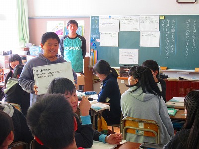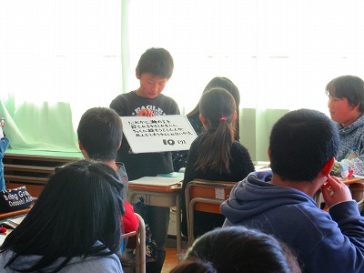 「太一が瀬の王のことを生涯だれにも話さなかったのはなぜ?」の発問にグループで答えを出し、発表していました。グループごとの答えを聞きながら、説得力のある考えが見つけ出されていきました。
