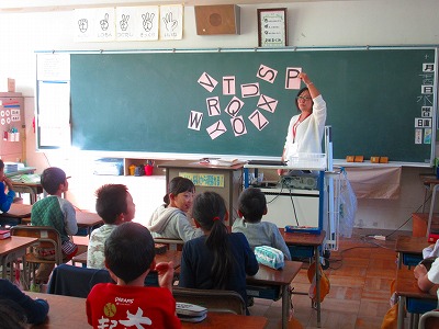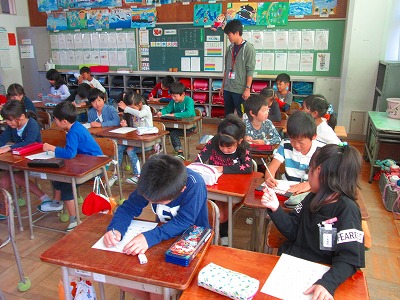 2年生が英語を学びました。今日はアルファベットを覚えて書く学習でした。プリントに書かれたアルファベットをよく見て、正しく書くことに取り組んでいました。