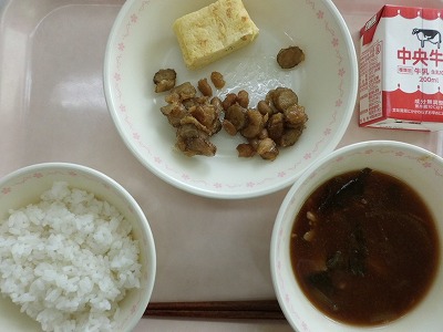 ごはん 牛乳 厚焼き卵 大豆とごぼうの揚げ煮 じゃがいものみそ汁