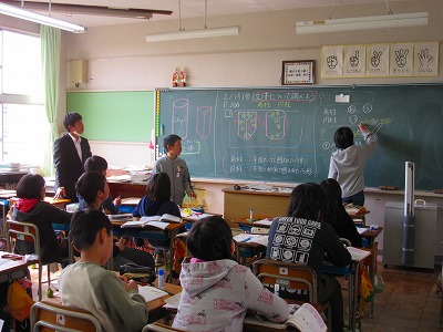 5年生が角柱と円柱についての問題を解いていました。側面や底面の重要語句や高さはどこに表れているのかを問題を解きながら確認していました。