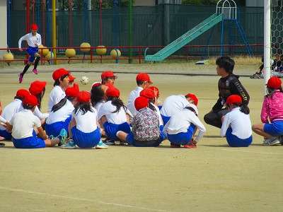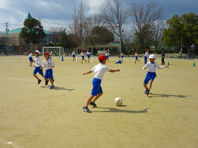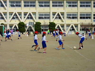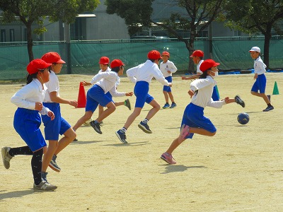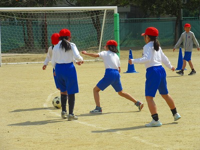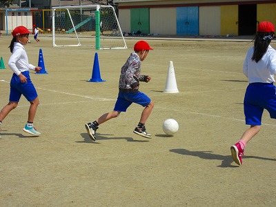 4年生が体育でサッカーに取り組んでいました。ボールを受けてから相手をかわすフェイントの動作がよく見られるようになりました。攻守にスピードが出てきました。
