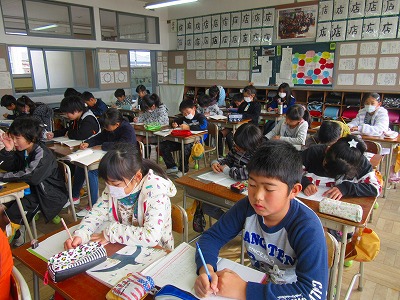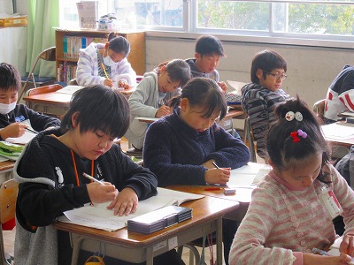 4年生がCDデッキから流れる声を聞きながら、大事なことを落とさずに聞き取る学習をしていました。ノートに聞き取った内容を集中して書き込んでいました。