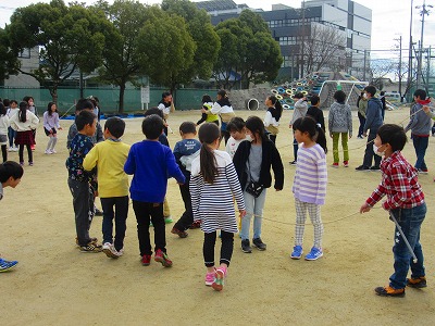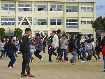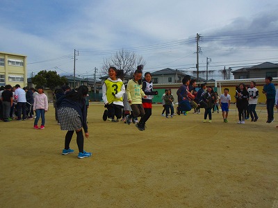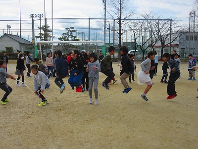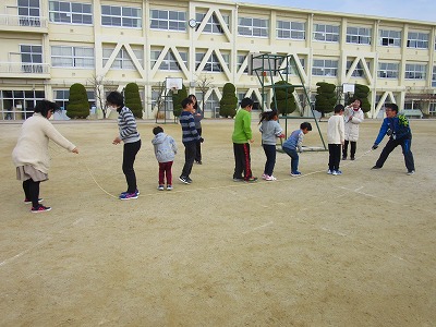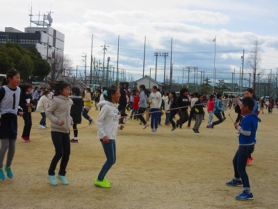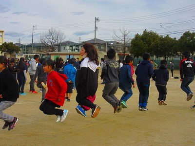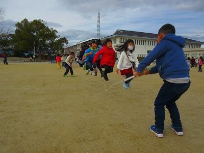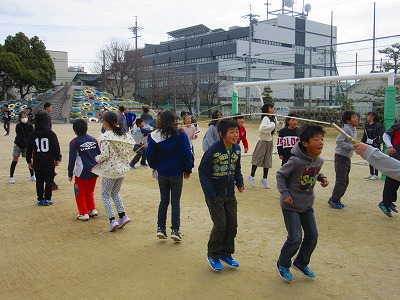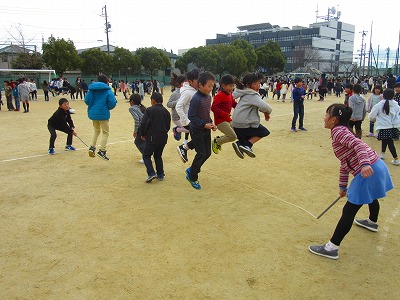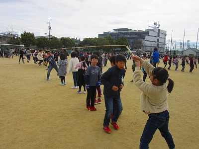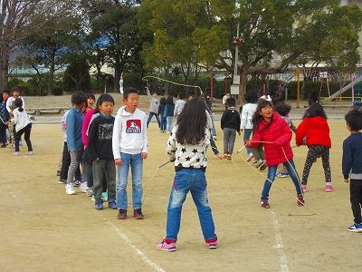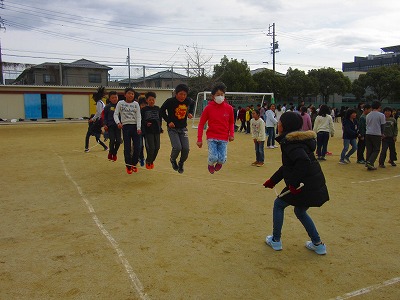 5分間の全員跳びに挑戦しました。かけ声に合わせて心を一つにしてみんな頑張っていました。なわに引っかかっても、何度も繰り返し跳び続ける姿に子どもたちの成長を感じました。
