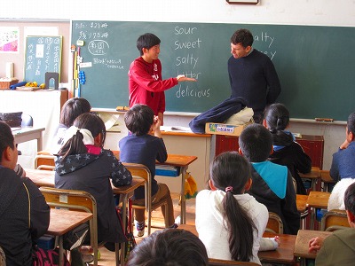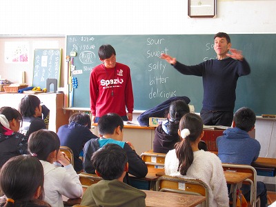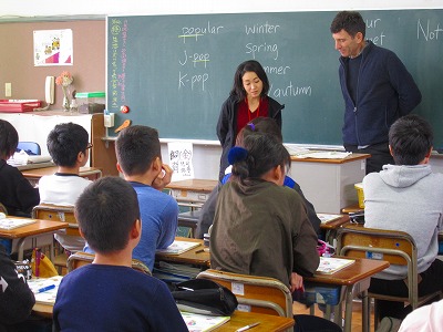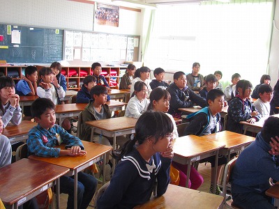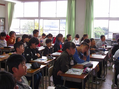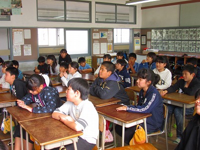 6年生が英語活動で担任教師とマシュー先生の会話を聞いて、マシュー先生の英語での質問に答える学習をしていました。リスニングの力が確かめられていました。