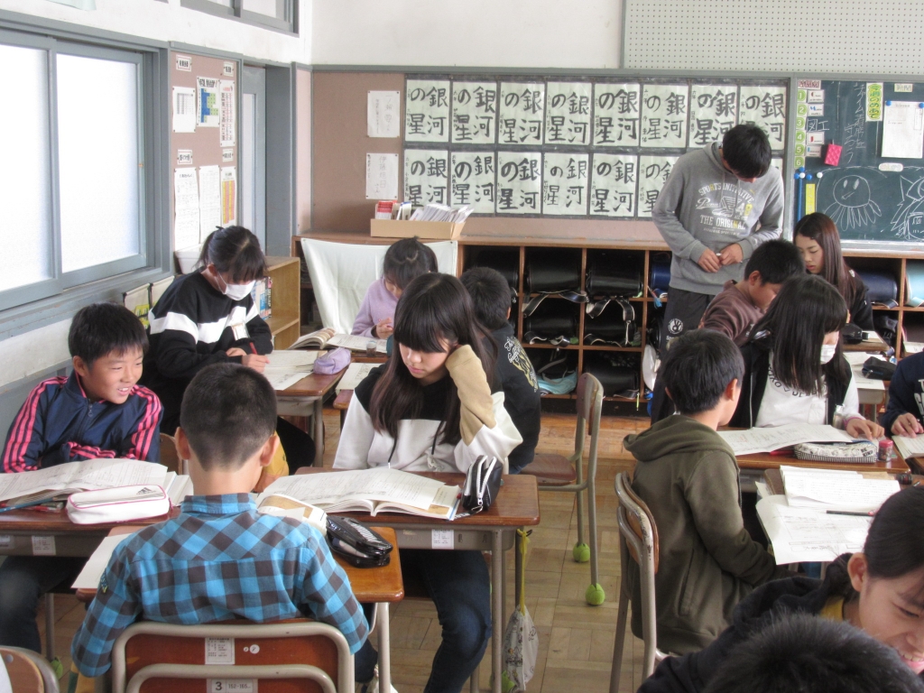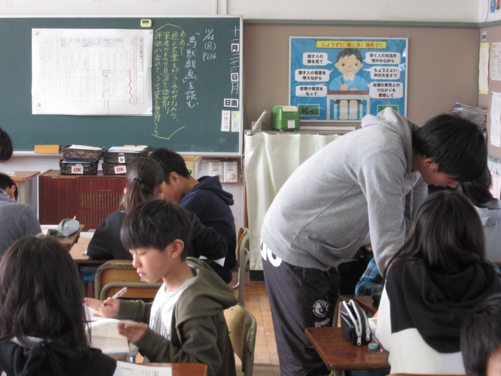 6年生が国語の学習で「鳥獣戯画を読む」を学んでいました。筆者のものの見方を読み取り、評価が表れる言葉を学習プリントを使って整理していました。