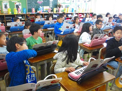 2年生が音楽の授業で「あえてよかった」を学んでいました。交互に歌を歌ったり、けん盤ハーモニカを演奏したりといろいろな組み合わせをして楽しんでいきます。