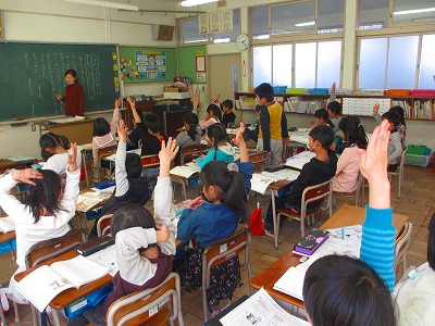 1年生が国語の学習で「だってだってのおばあさん」を学んでいました。99歳のおばあさんが誕生日にしたことを、教科書を読みながらみんなでまとめていました。楽しい話の中から、自分の好きなところをさがして読んでいきます。