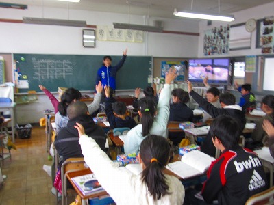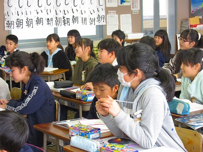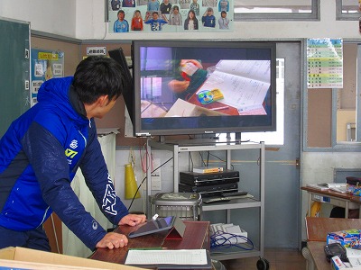6年生が理科の実験で行った手回し発電機をまわして電気を作った前時の学習を振り返って、まとめの学習をしていました。手回し発電機をまわしている様子を録画した動画を大型テレビで再生しながら、改めて結果を確認していました。