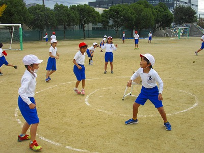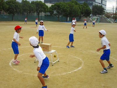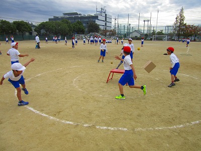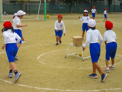 2年生が円の中心に置かれたダンボール箱を的にして、やわらかいソフトボールを投げていました。2重円の外から攻撃する子がボールを投げるのを2重円の内側にいる子が的に当てられないように守りました。攻守ともに素早い動きが必要です。みんな元気いっぱい走り回っていました。