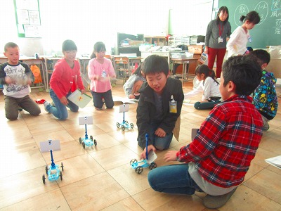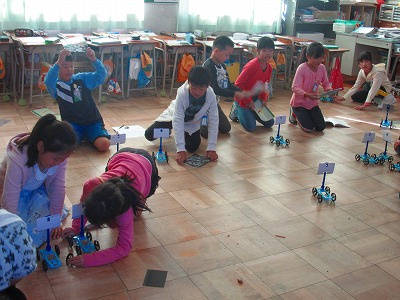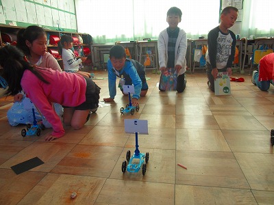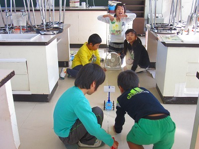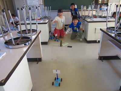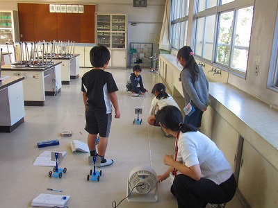 3年生が理科の学習で送風機を使って風の力で車を走らせていました。送風機で送る強さの違いによって車が走る距離に違いがあることが分かりました。