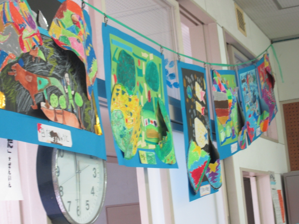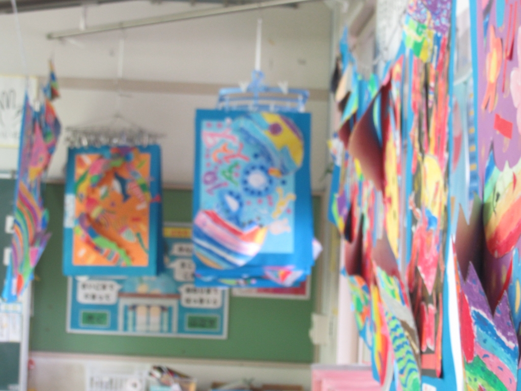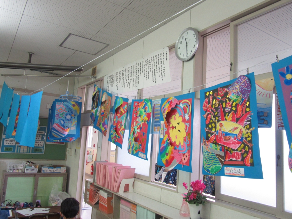 2年生の教室に、まさに出番を待つかのように作品展で展示する作品が教室の天井近くに並んでいました。子どもたちが懸命に作り上げた大切な作品です。乾燥させるとともに人の手が触れない安全な保管状態になっていました。