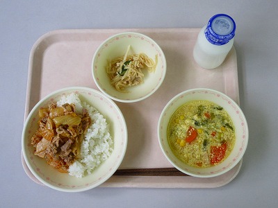 豚キムチ丼、牛乳、棒棒鶏、中華風かきたま汁