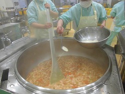 棒棒鶏などの和え物は、食材ごとで茹で時間が異なるため、食材ごとで茹でています。特にきゅうりは、シャキシャキ感が残るように調理員さんが見極めてあげてもらっています。今回は、胡麻香る棒棒鶏にしました。