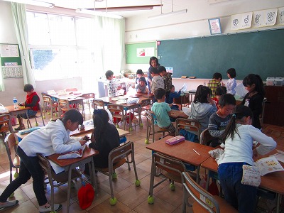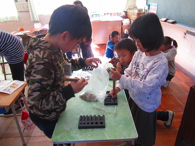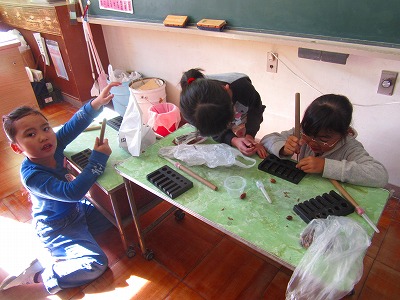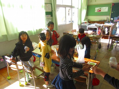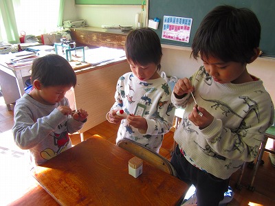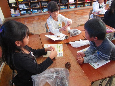 1年生がどんぐりや松ぼっくりを使ってどんぐりこまやでんでんたいこ、マラカスを作っていました。教師から「遊んでいいよ」と、声がかかるとみんなとてもうれしそうでした。