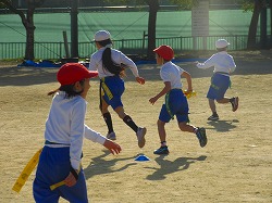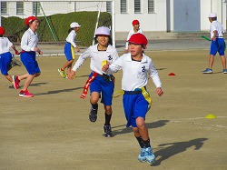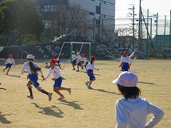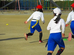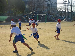 4年生の体育で「タグラグビー」が始まりました。まずは、腰に付けられたタグをとることや、とられないように相手をかわす動きづくりの学習です。広いエリアの中を走り回ることで、体力や走力を高め、素速い身のこなしができるようになっていきます。