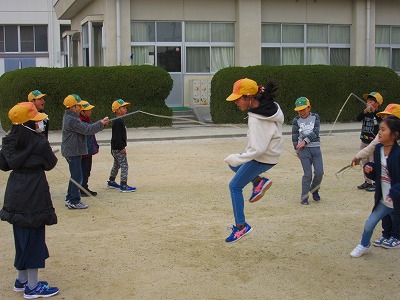 サニータイムの時間、運動場では多くの子どもたちが長なわとびを楽しんでいました。毎日練習しているので、スムーズに跳べる子が増えてきました。みんなとっても楽しそうでした。