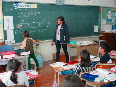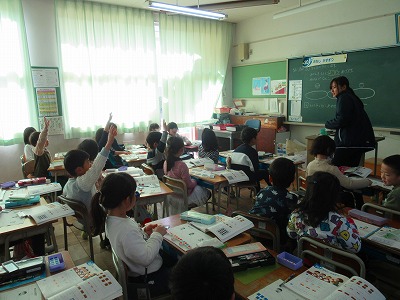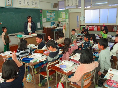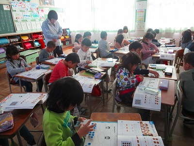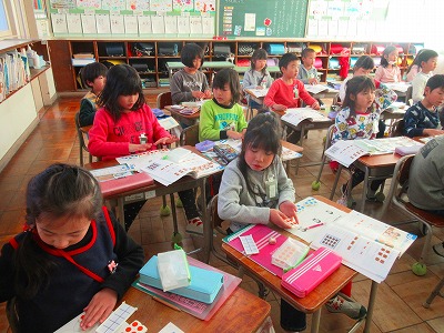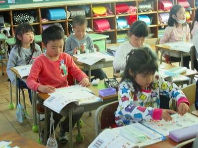 1年生が算数で数図ブロックを使って、○+○+○=?の問題を解いていました。○には同じか数が入るたし算の計算でした。学習プリントの上に同じ数のブロックを置くことによって、うまく答えが求められていました。