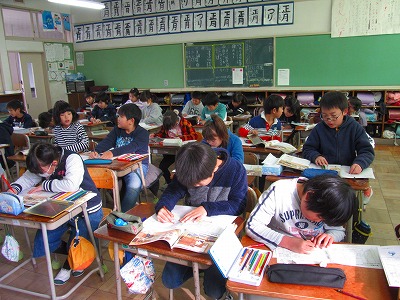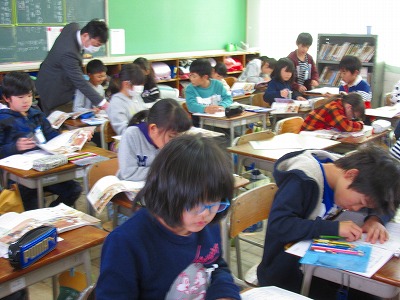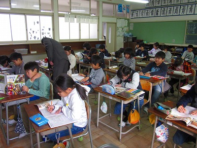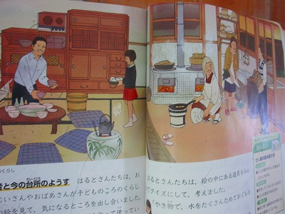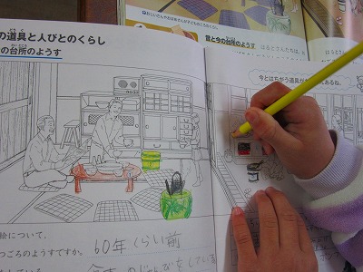 3年生が社会の学習で昔の道具について学んでいました。「しちりん」について詳しく学んだ後、社会科ノートの絵から「かまど」「水がめ」「ちゃぶ台」「おひつ」「火ばち」「鉄びん」をさがし、教科書の絵を参考にして色鉛筆で色をぬっていました。