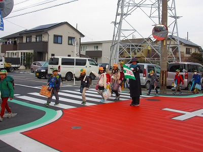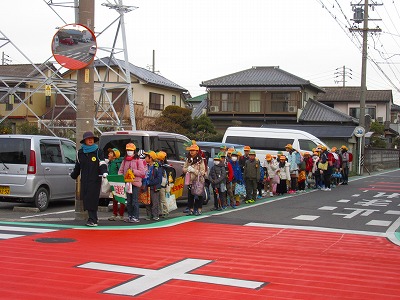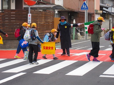 朝の登校風景です。子どもたちの登校は、通勤の時間と重なり多くの自動車の往来に出合います。危険な交差点では、毎日交通指導員さんに守られながら登校しています。