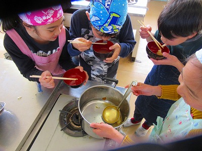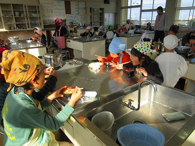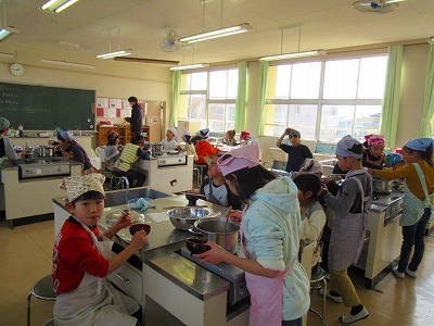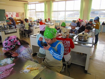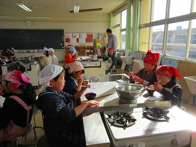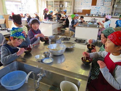 3年生が「昔の人が食べていたすいとんを実際に作って食べてみよう」をめあてに、すいとん作りに挑戦しました。どのグループも鍋の中があっという間に空っぽになっていました。昔のくらしを「すいとん」を通して身近に感じることができました。
