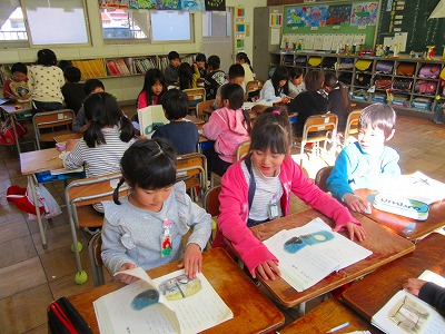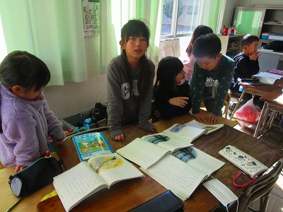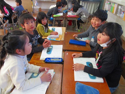 1年生がグループで音読練習の方法を話し合い、だれがどの部分を読むのかを決めたあと、大きな声か小さな声か、ゆっくりか速いか、などの読み方について意見を交流し合っていました。