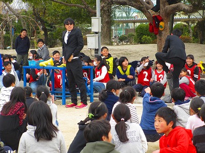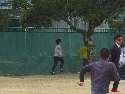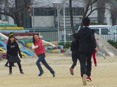 卒業式にともに参加する5・6年生が合同学年レクリエーション(佐屋っ子タイム)を楽しんでいました。背の高い2人の先生がジャージを脱いでスーツ姿に……。ハンターゲームが始まりました。およそ200人によるハンターゲームで、運動場をみんなで駆け回って大盛り上がりでした。楽しい思い出が残されていました。