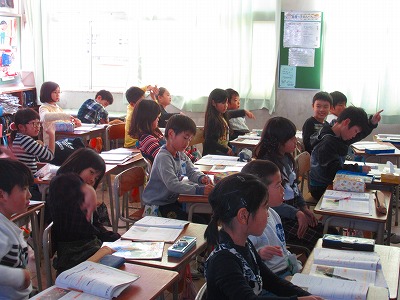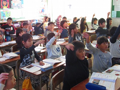 3年生が「メヌエット」を聴きながら、楽曲に合う身体表現を 工夫し、拍子の特徴を感じ 取っていました。3拍子のリズムを体を動かすことでしっかりつかんでいました。