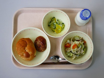りんごパン、牛乳、ハンバーグのデミソースがけ、大根のイタリアンサラダ、ポトフ