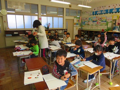 1年生が「貝」と「見」、「人」と「入」、「右」と「石」など形が似ている漢字の違いをしっかり確認しながら書いていました。「右足で石をける」など似ている漢字が入った短文作りも合わせて学びました。