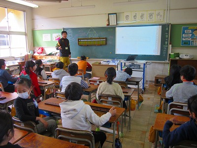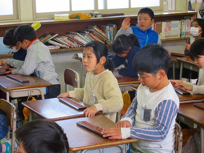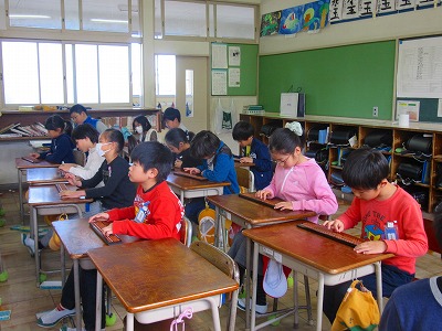 3年生が「ろろばん」を学んでいました。大きな数で学習した一、十、百、千、万という位取りと、そろばんの仕組みとを重ねて考えることになります。そろばんの珠(たま)の位置と表している数を一致させることを学びました。