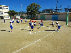 とても気持ちの良い青空のもと1年生は運動場で体育を行いました。はじめに遠くの西の空に雲を見つけ、子どもたちが国語で学習した「くじらぐも」を思い出して喜んでいたので、みんなで手をつないで「天まで届け、1、2、3」と叫びました。物語のように空のくじらぐもに乗れなかったので、しょんぼりして体育の授業に気持ちが切り替わりました。ころがしドッジは周りの枠の形を自分たちで考えました。ハート、三日月、六角形、星などが地面に書かれたら、あっという間に元気を取り戻し、ルールに合わせて、みんなとゲームを楽しむことができました。