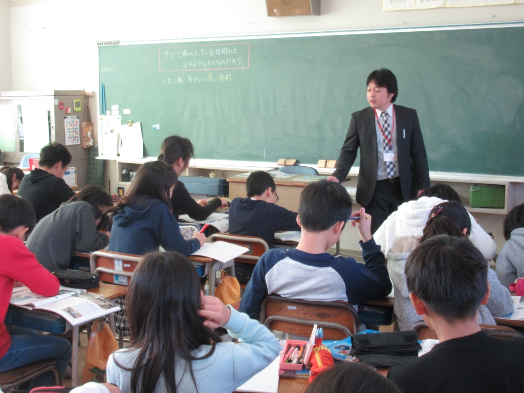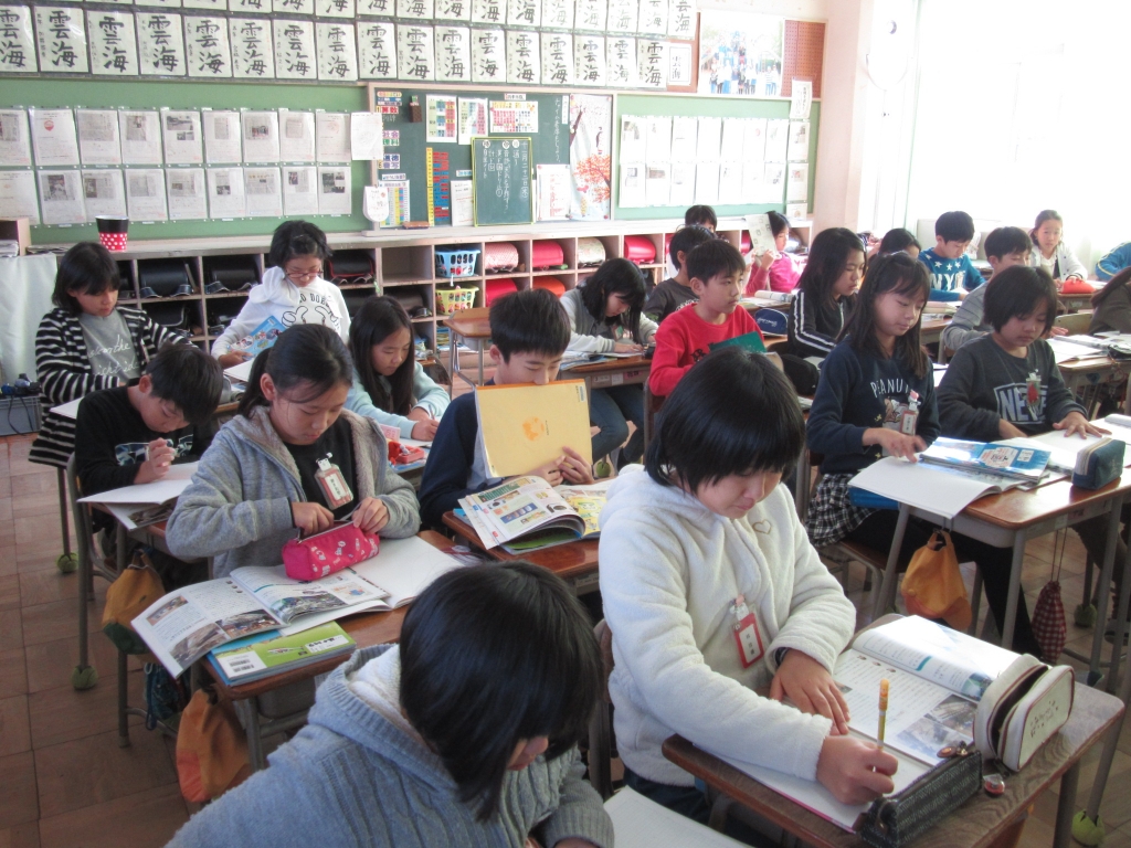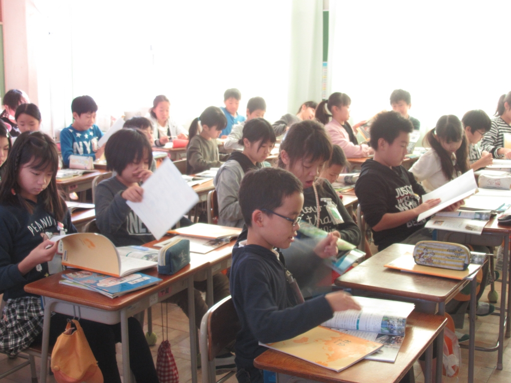 5年生が社会の学習で中小工場の果たす役割や特徴について話し合っていました。これまでの知識や教科書の写真や資料を見ながら考えることによって、日本の工業の特色について理解していきます。