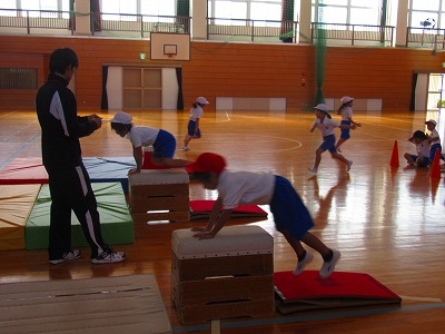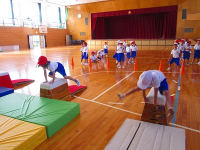1年生が跳び箱を使って助走を取って勢いよくまたぎ越す運動に取り組んでいました。何度も繰り返すうちに踏み切り板をうまく使うことや手を前の方につくことなど、大切なこつをつかんでいました。
