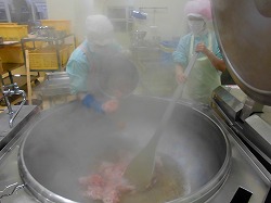 大根のうま煮は、最初にみじん切りにしたしょうがと鶏ひき肉を炒めます。そこに、油抜きをした生揚げ、半平、にんじん、里芋、大根を加え、醤油、三温糖、みりんを加えて煮込みます。最後にいんげんを加えてさっと煮こんでできあがりです。なるべく味がしみ込むように、長めに煮込みました。