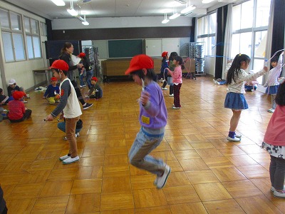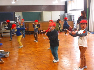 1年生が視聴覚室を使って「なわとびがんばり表」に挑戦していました。がんばり表にある跳び方と回数をクリアできたら、次の級に進んでいきます。上の級めざしてがんばり続けている1年生でした。