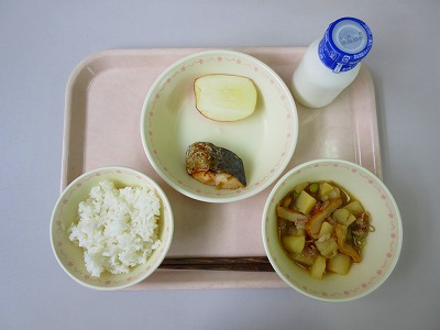 ご飯、牛乳、さわらの香味焼き、肉じゃが、りんご