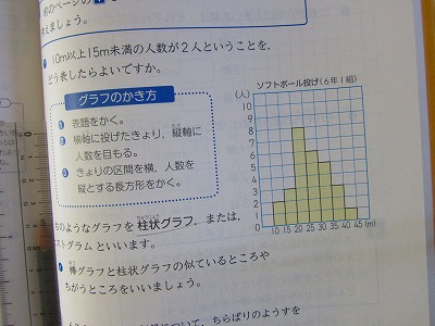 6年生が算数でグラフのかき方を学んでいました。ソフトボール投げの記録を縦軸に人数、横軸に投げた距離を取り、ちらばりの様子を柱状グラフで表しました。