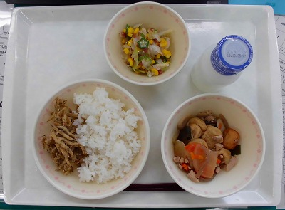 ご飯、牛乳、関東煮、小女子の唐揚げ、梅肉和え
