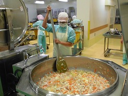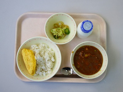 さつまいもがおいしい季節になりました。今日は、さつまいもを入れたカレーを作りました。オムレツを組み合わせましたので、『オムカレー』にして食べてみてもおいしいですね。副菜のキャベツのあっさり漬けでさっぱりとバランスよく仕上げました。