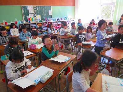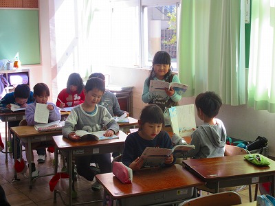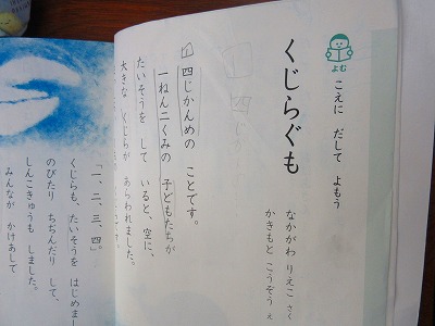 1年生が「くじらぐも」を声に出して、大きな声で読んでいました。教科書の挿絵を見て、イメージをふくらませながら、はっきりとした発音に注意して読んでいました。