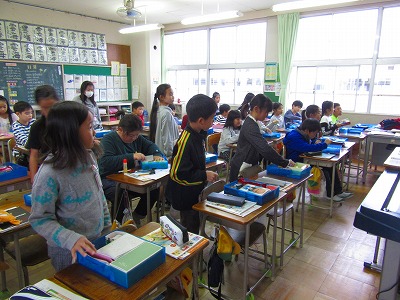 5年生が家庭科の学習で、身の回りをきれいにすることについて話し合っていました。机の中の道具箱の整理整とんの仕方のアイデアをみんなで話し合っていました。