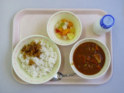 夏休み前の最後の給食は夏野菜をたっぷり使用したカレーです。給食のカレーは、にんにくとしょうがで最初に香味だしをしてからお肉を炒めるので、香りがよく、食欲そそります。夏休みも規則正しい生活で過ごせるといいですね。